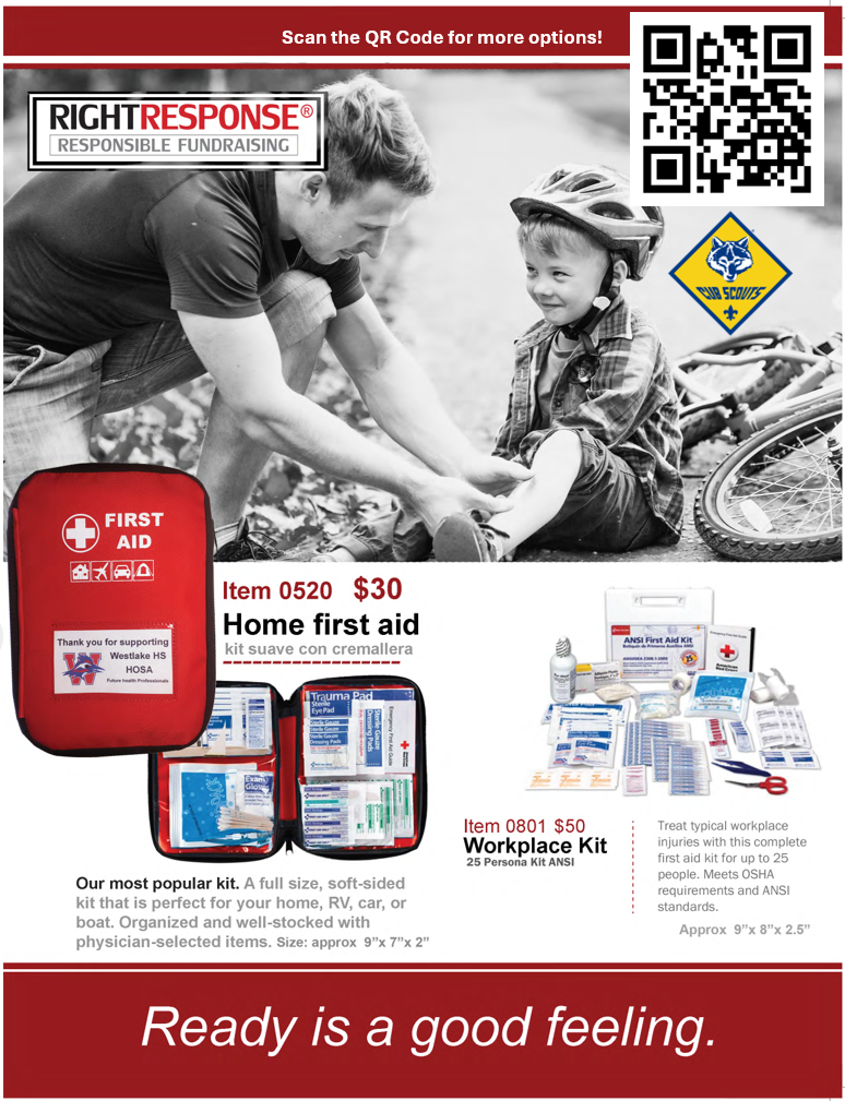 We’re offering high‑quality first aid kits—perfect for home, car, workplace, or gifts. Every purchase supports our pack’s activities like camping, pinewood derby, and pack events.